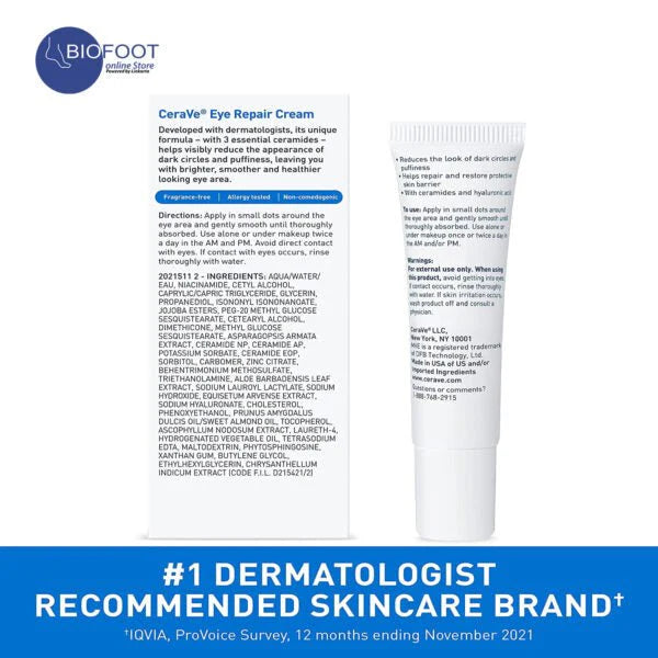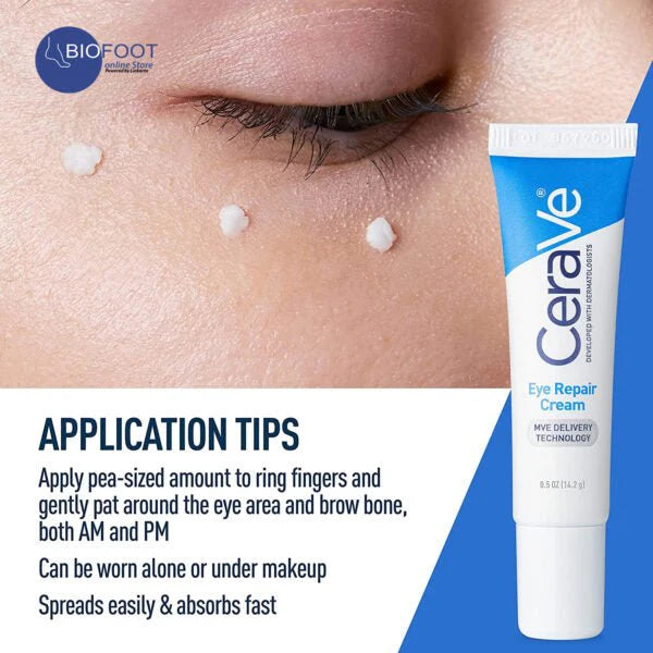 لاستخدام كريم CeraVe Eye Repair (14 مل)، ضعي كمية صغيرة بلطف على إصبعك البنصر وربتيها برفق حول منطقة العين، بما في ذلك تحت العينين وعلى طول عظم محجر العين، صباحًا ومساءً للحصول على بشرة منتعشة ورطبة.