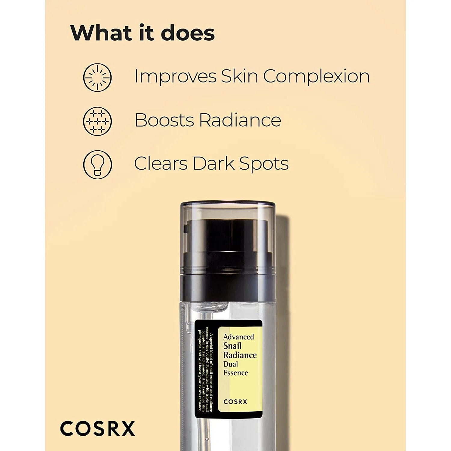 الاتساق هو المفتاح! استخدمي مستحضر COSRX Advanced Snail Radiance Dual Essence صباحًا ومساءً للحصول على أفضل النتائج. مع مرور الوقت، ستلاحظين بشرة أكثر إشراقًا وترطيبًا مع تحسن ملمس البشرة ولونها.نصائح إضافية: