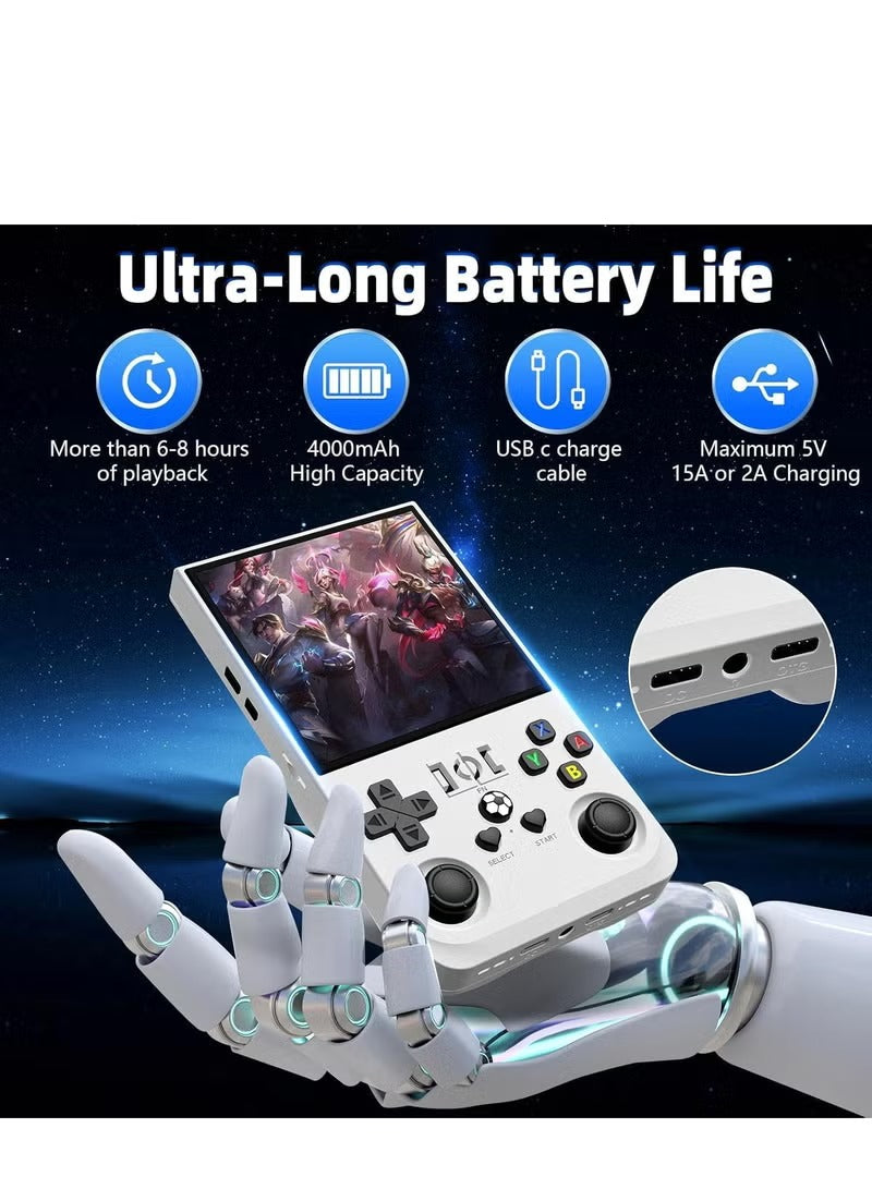 - Designed for portability, this mini retro game console features a compact and lightweight design. The 4000mAh rechargeable battery offers up to 10 hours of playtime, making it perfect for gaming on the go. It also includes built-in speakers and a 3.5mm headphone jack for an immersive audio experience.