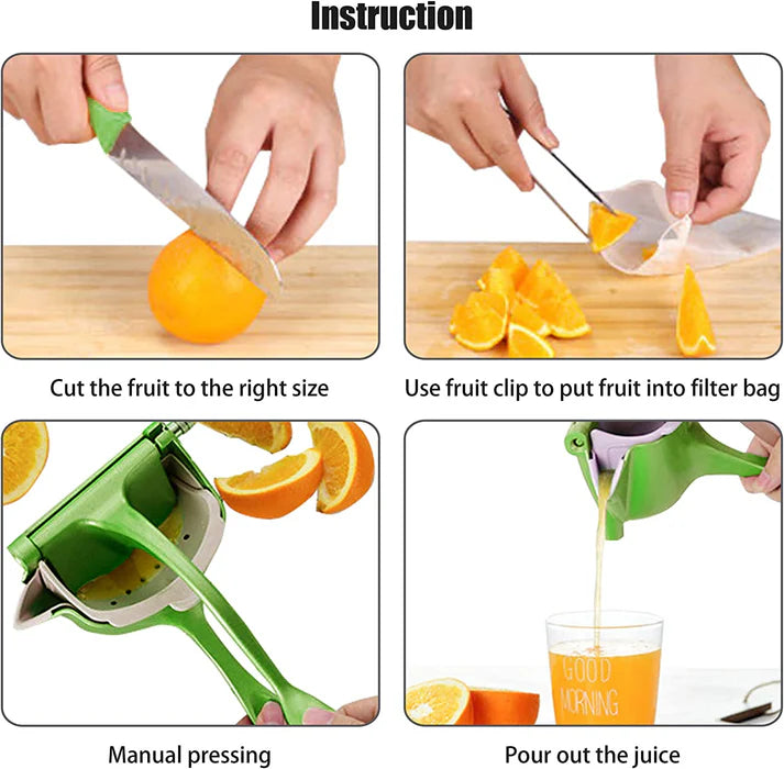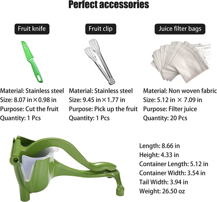 【Perfect Accessories】We studied the survey reports and considered the usage needs of different people; Shaoduoli Manual Fruit Juicer is equipped with the perfect accessories for each users; It includes a fruit knife for you to cut some fruit into small pieces before squeezing; A clip with drainage function,which is convenient for you to handle the fruit residue after juicing; 20Pcs food-grade juice filter bags, so that you can squeeze more delicate and clear juice.