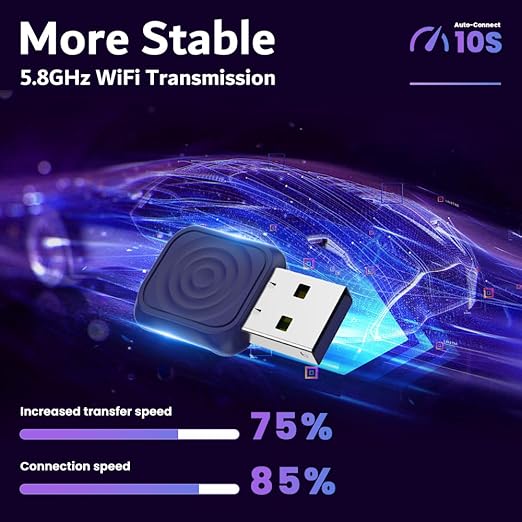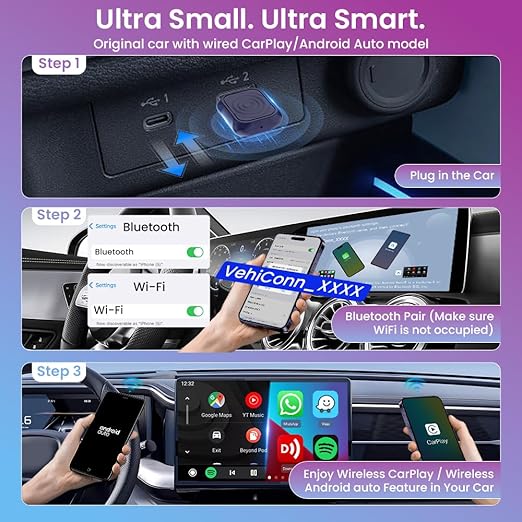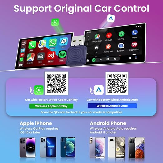 MINI Wireless CarPlay Android Auto Adapter enables seamless Wireless CarPlay and Android Auto functionality by plugging into USB-A or Type-C ports.