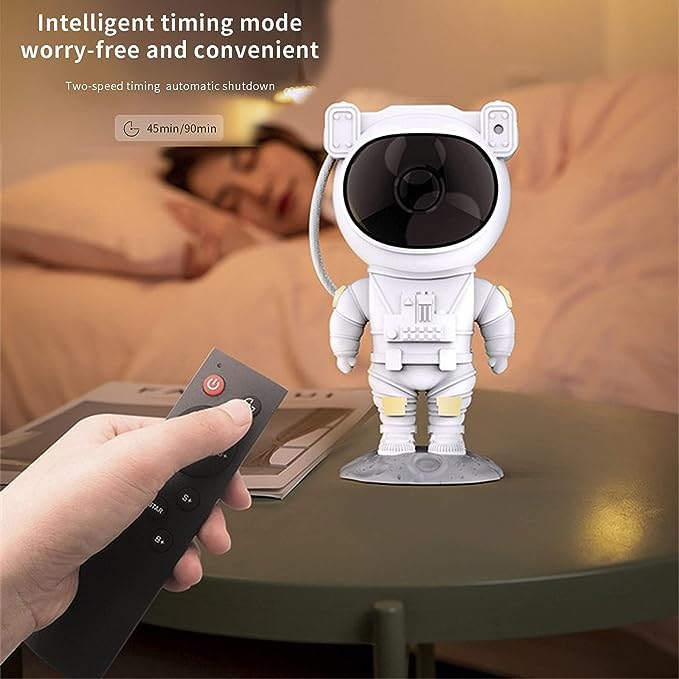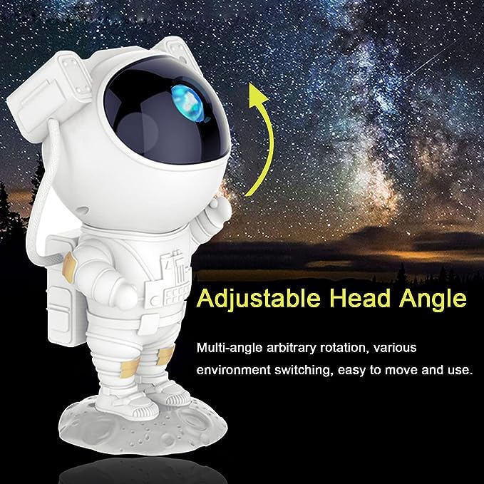 HD Astronaut Galaxy Projection Light :2021 astronaut galaxy projector that can project twinkling stars, moon and colorful nebulas to create a dreamy night sky in the chosen place. Ideal to create a romantic place for your lover, bring a pleasant time for your children, or help you relax after a stressful day. Multiple Lighting Modes The projector lamps can project stars, moon and nebula. Depending on your mood, you can choose to project stars, nebulas of different colors, and the moon in combination or separately. Each of these projection modes will give you a stunning starry light show of the galaxy and make you feel like you are in the universe. 2 Sync Modes & Remote Control:2 sync modes: about 40 minutes and about 90 minutes, automatic shutdown. In addition, this galaxy star light projector includes a remote control, helping you change the settings of the star light projector such as stars, nebula color, nebula motion speed, projection brightness, etc., you can easily access these settings without getting up. Adjustable Projection Angle, Easy to Use The head of the astronaut projection lamp can be moved, can be projected at any angle at will. You can choose to play the projection on the ceiling, wall or other directions. Provide a wonderful and dreamy environment for your bedroom or playroom.