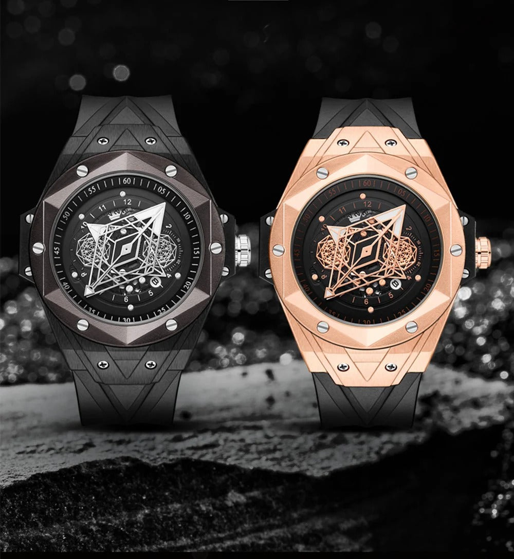 The Pintime Watch is a bold statement of style and innovation, designed for those who dare to stand out. Featuring a geometric skeleton dial, hexagonal bezel, and durable silicone strap, this timepiece blends modern artistry with precision engineering. Perfect for both casual wear and special occasions, the Pintime Watch is more than just a watch – it’s a symbol of individuality and confidence.